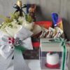 Belgian milk chocolates in red and white arranged to represent the glorious Bahrain flag and a cute flower well in the side. All arranged in a clear black wooden tray
