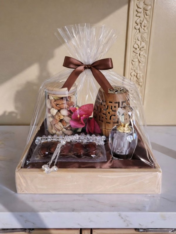 A beautifully curated Ramadan gift pack presented on a solid wooden base, elegantly lined with rich satin fabric for a luxurious finish. Featuring premium dates, a crystal tasbeeh, elegant bukhoor burner, crystal attar bottle, and a jar of mixed nuts. Wrapped in clear cellophane and finished with a brown satin bow, this refined arrangement is perfect for meaningful Ramadan gifting and corporate gifts