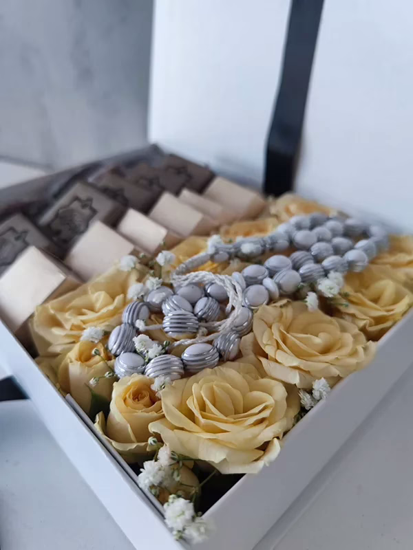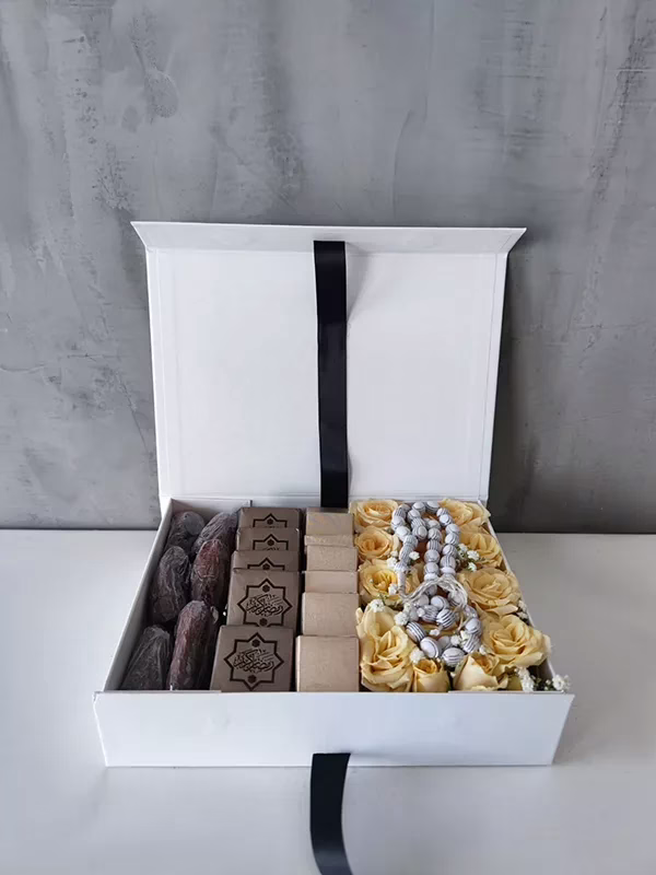 Beautiful craft white magnetic boxes comes with a delightful selection of chocolates and individually wrapped premium dates. To add to the surprise to anyone who receives the gift box, is a fresh bed of roses on the side with a thasbhi on top. Ideal for wishing those you love a blessed Ramadan and for corporate gifting as well.