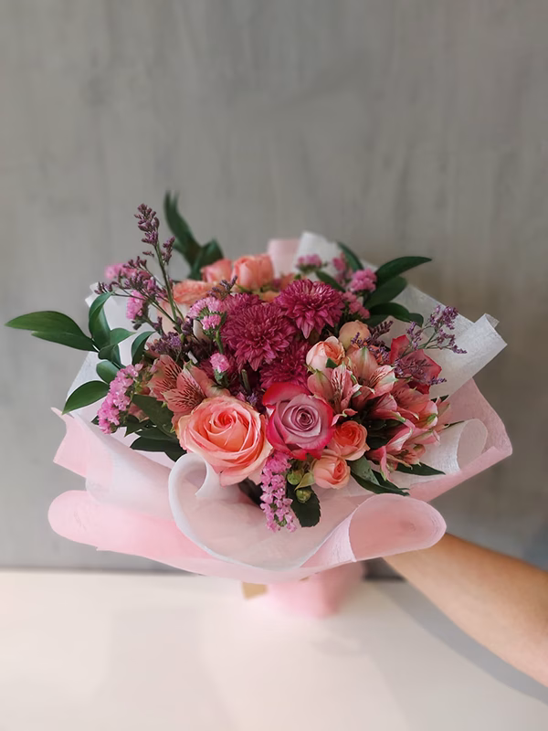 Beautiful blend of dark and pastel shades of a variety of blooms. Specially made to remind someone special that you are thinking of them