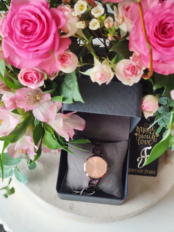 In the presence of a bouquet of pink blossom rests rose gold gift watch, setting a reminder of the preciousness of time. Together, they create a captivating display that is both sentimental and sophisticated.