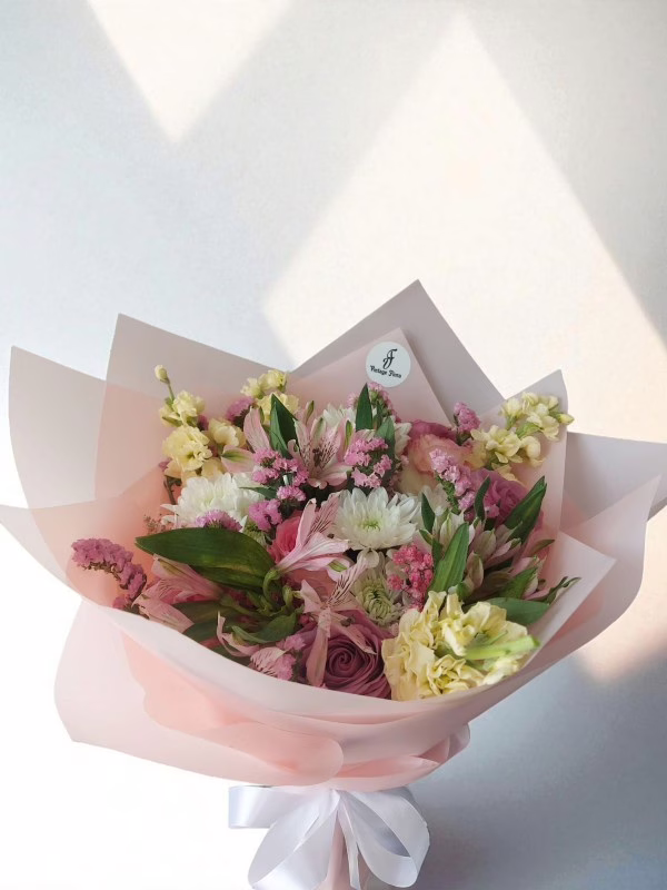 Whispers of pastel blooms beautifully wrapped in light pink for an elegant touch.