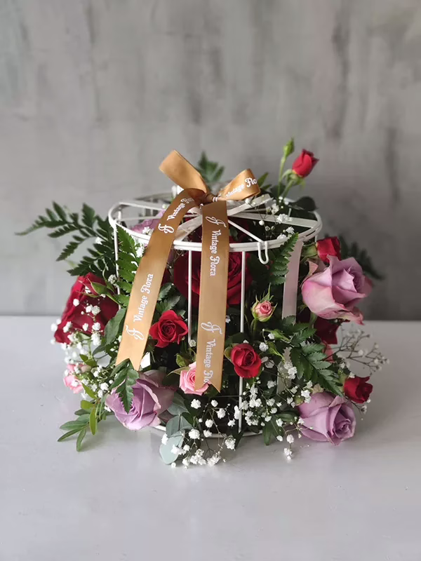 In attempt to divert from the usual vases and containers, we have used here, a white metal cage as a base for this beautiful and unique flower arrangement. It also made to symbolize a special meaning this valentines.