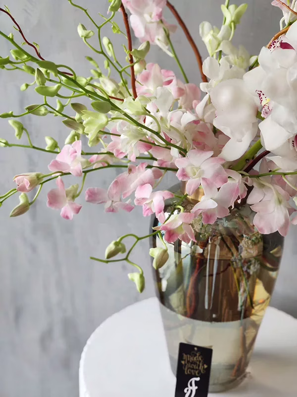 This beautiful centerpiece features a stunning arrangement of pink and white orchids nestled in a sleek glass vase. The delicate blooms create a sophisticated and timeless look that is perfect for any occasion.