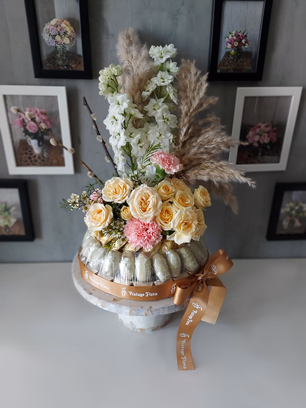 Beautiful fresh flower arrangement accompanied with assorted chocolates and white chocolate coated dates. Comes with an exquisite mother of pearl stand for keepsake.