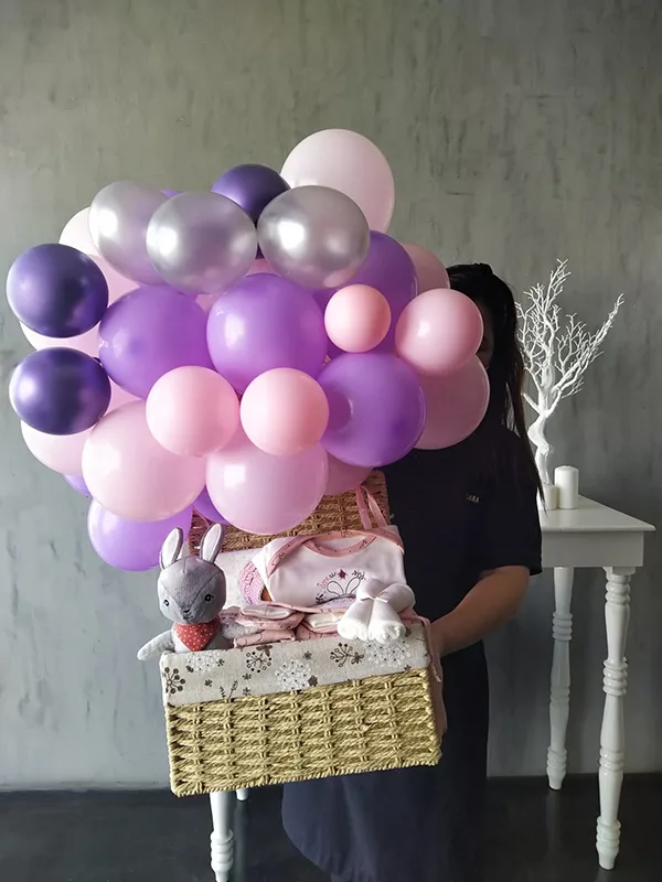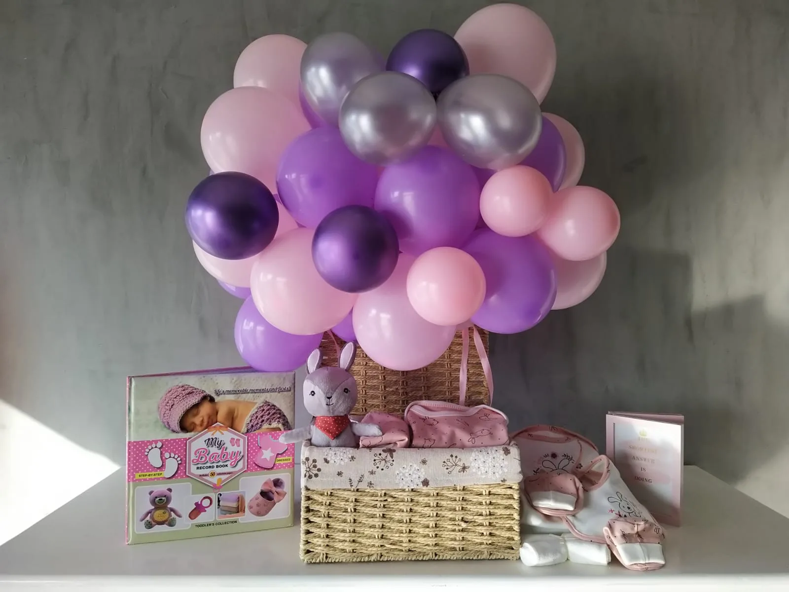 This stunning new baby girl hamper is filled with beautiful new baby delights. Carefully handpicked and stylishly presented in a brown wicker basket. Adding to the extra wow factor, this new born hamper comes with a Balloon deco and cute soft toy to cuddle.