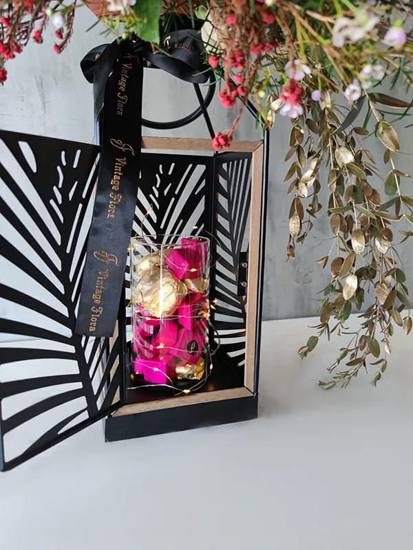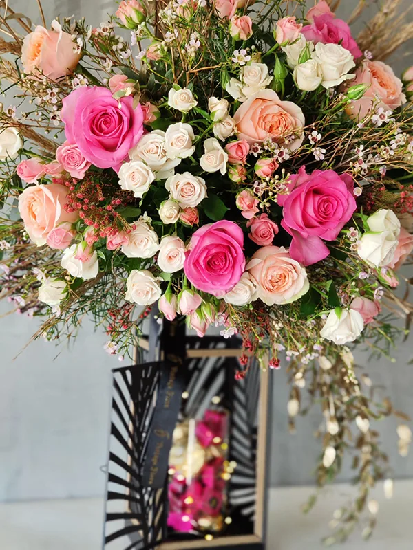 If you want it big, fancy and stylish all in one package this one is for you. A collection of pastel flowers and dry fillers beautifully arranged in a keepsake lantern and glass base filled with our delicious chocolates.