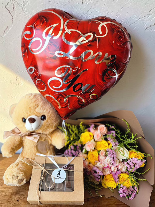 Make every moment unforgettable with the Super Combo — the perfect all-in-one gift that speaks straight from the heart 💝. This charming set brings together a cuddly teddy bear, a stunning bouquet of fresh, vibrant flowers, a delicious treat box, and a bold “I Love You” heart balloon to tie it all together