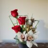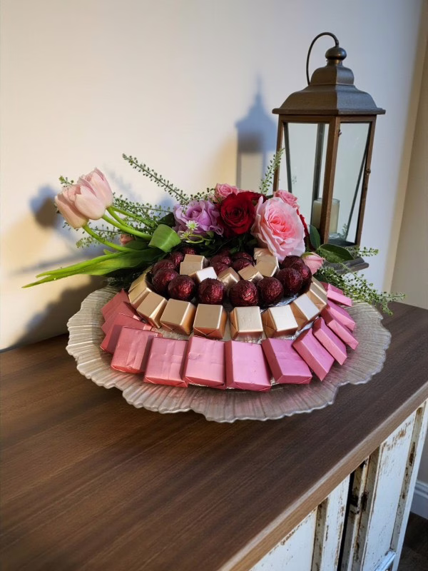 An exquisite arrangement of fresh flowers and fine chocolates, beautifully presented on a glass tray. A perfect for meaningful festive gifting.