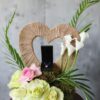A stunning white and green floral arrangement displayed on an elegant metal cutwork stand. Featuring fresh white blooms and lush greenery. Perfect as a statement centerpiece or a thoughtful gift, this arrangement blends purity and elegance with modern design.