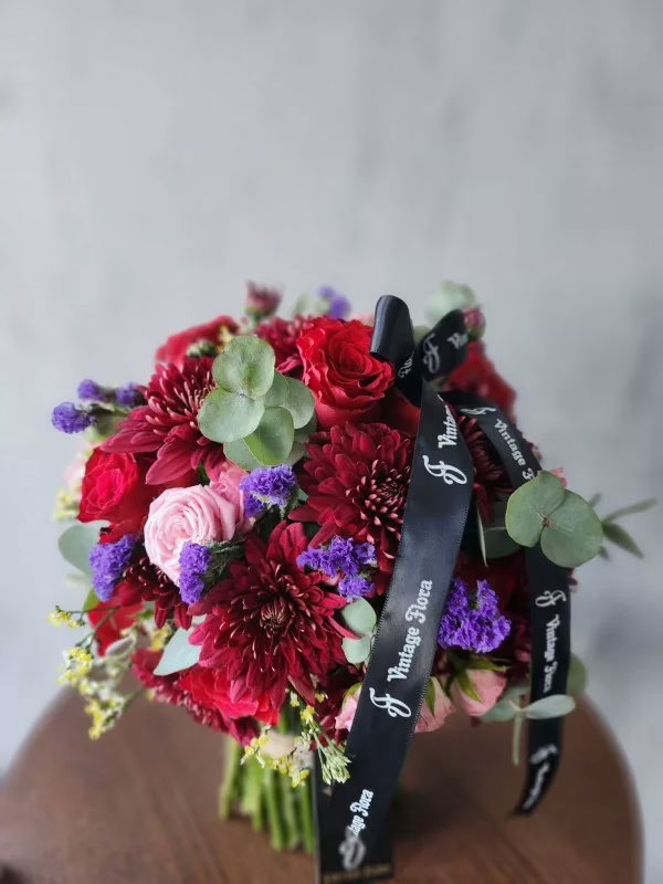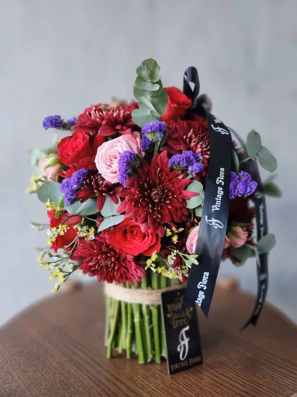 A sophisticated blend of velvety red roses, delicate pink blooms, and lush accents of purple and green, this bouquet brings timeless beauty to any occasion.