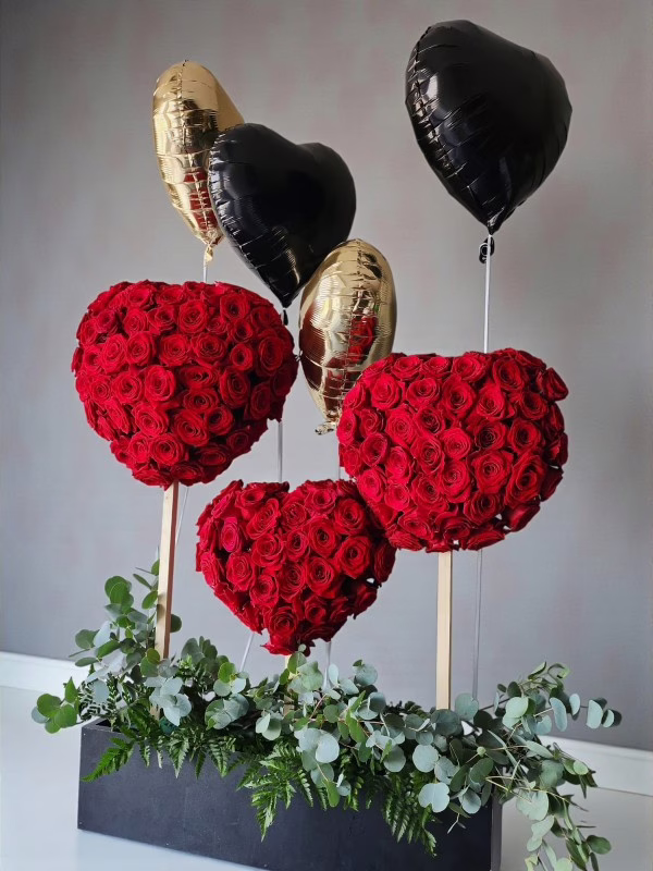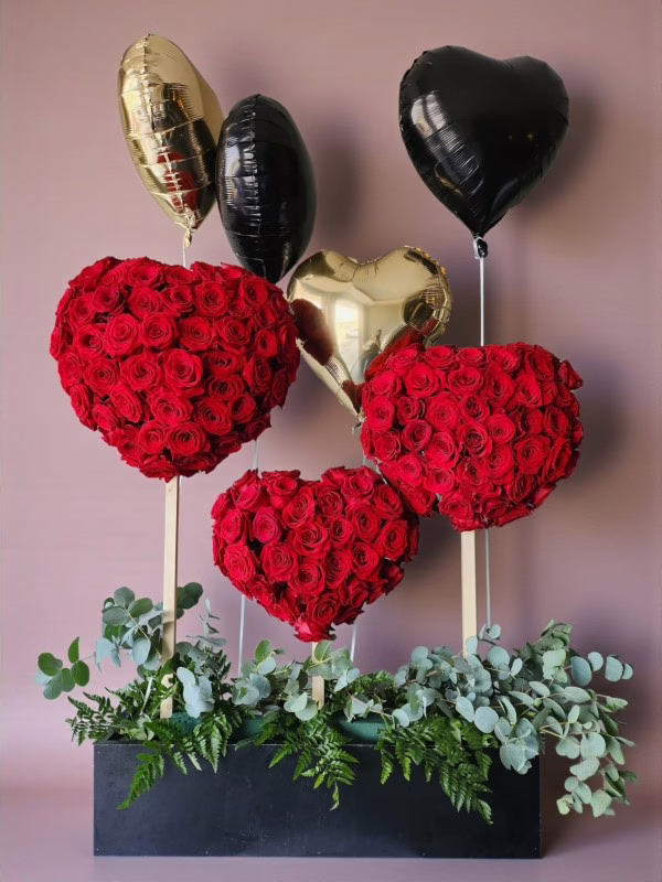 This luxury Valentine’s Day heart arrangement includes three standing hearts and four foil balloons in black and dull gold, perfect for luxury gifting.
