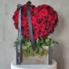 A cute bag with white lush roses and blooms and fillers and a delicious heart shaped chocolate cake