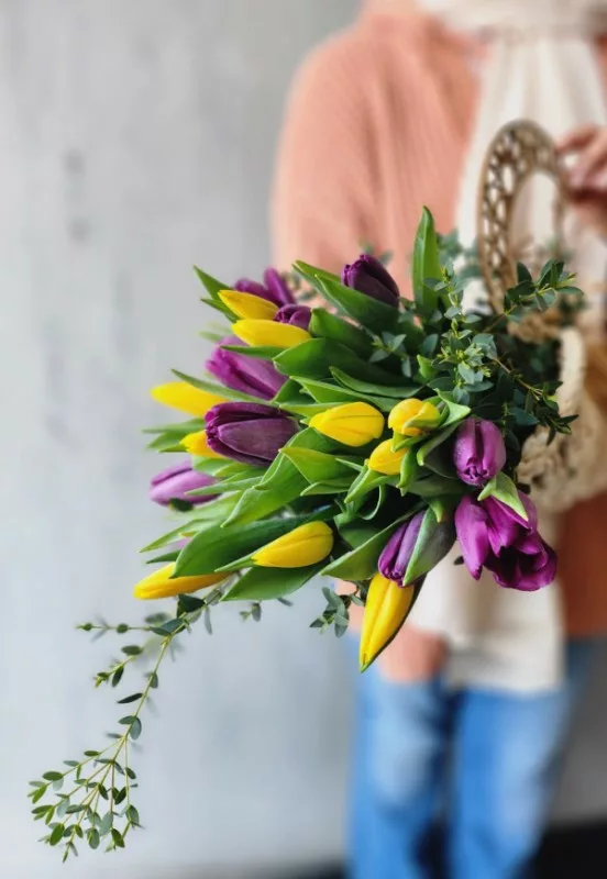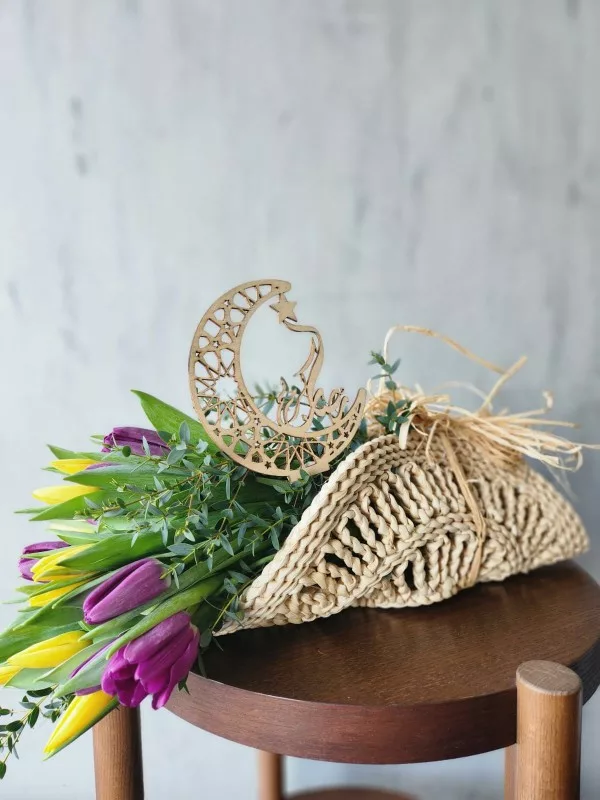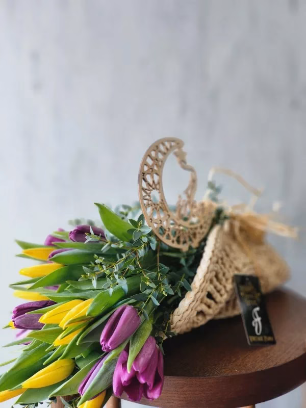A stunning bouquet of colorful tulips thoughtfully arranged and wrapped in a beautifully designed cane mat, blending rustic charm with timeless elegance.