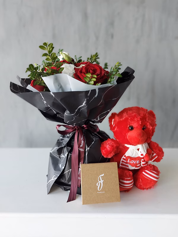 - Bouquet of fresh baby roses, fillers, and lush red roses