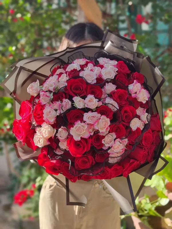 The roses are in full bloom, and their petals are a deep, velvety red and a crisp white. The flowers are woven along a fabric adding more to its character and charm. The black wrapping provides a dramatic contrast to the vibrant colors of the flowers.