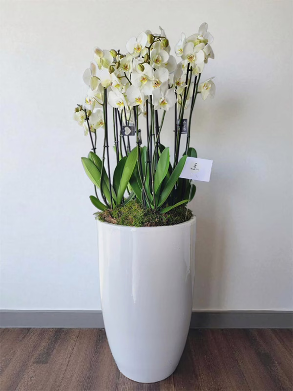 A stunning tall white vase showcasing elegant orchids a symbol of purity, grace, and timeless beauty.