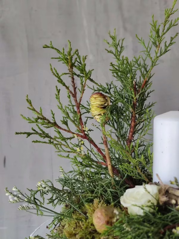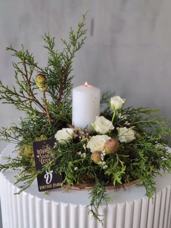 This vintage, floral table centerpiece with candle is a perfect way to add a touch of elegance and light to your Christmas table.