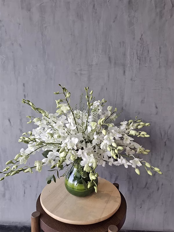 Unveil a touch of sophistication with our stunning White Orchid Elegance arrangement. Perfect for transforming any space, this lush bouquet of delicate white orchids in a vibrant vase exudes timeless beauty and charm.