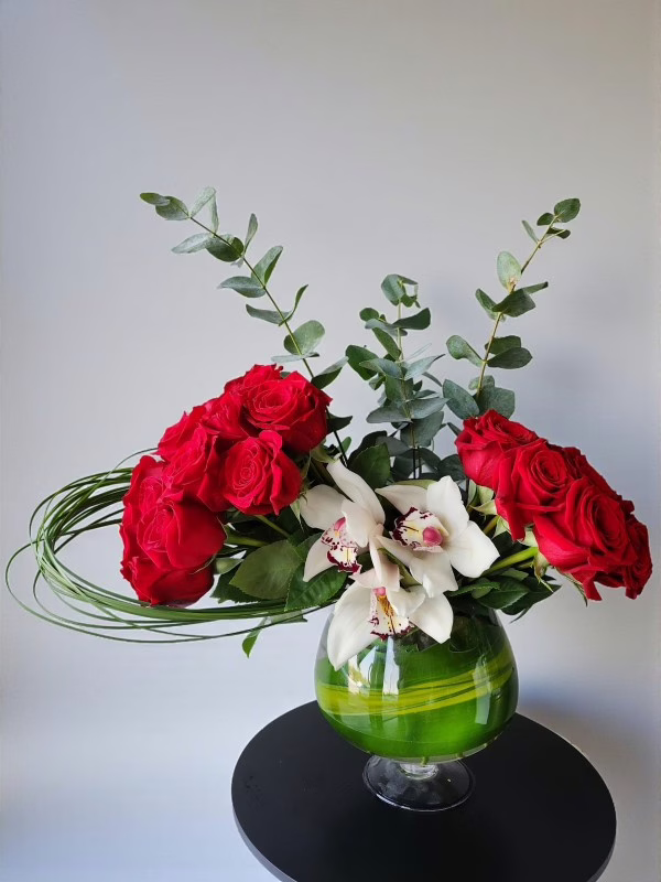 Elegant red roses beautifully arranged in a glass vase, created for Valentine’s Day, anniversaries, and meaningful romantic moments.